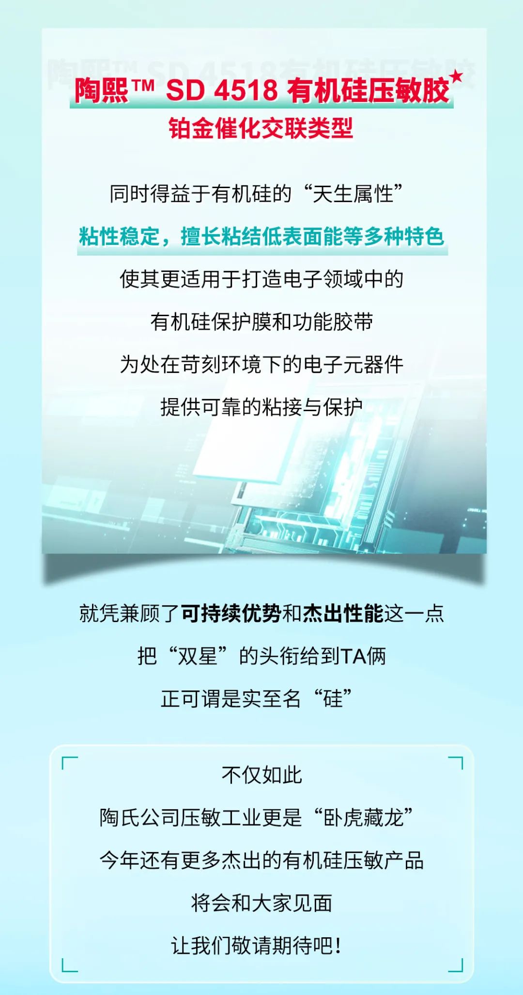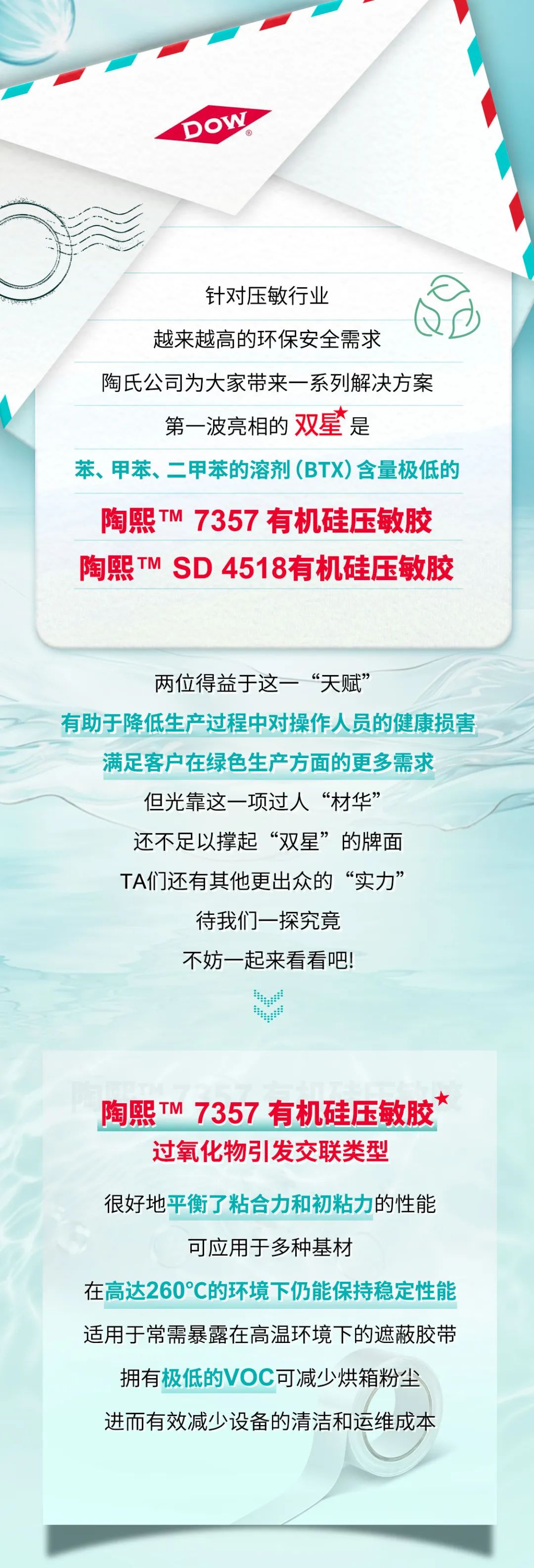 #关键词:陶氏、陶氏公司、环保型有机硅压敏胶、有机硅压敏胶、压敏胶、DOWSIL™、陶熙™、陶熙™ 7357 有机硅压敏胶、陶熙™ SD 4518有机硅压敏胶、可持续优势、高温稳定性、粘合力、初粘力、耐高温性、低表面能、电子元器件、遮蔽胶带