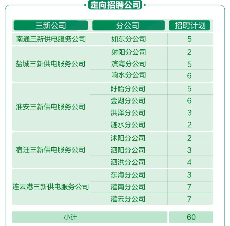 本批次共 14家三新分公司开展定向招聘,招聘总计划60个,招聘专业为电工类。各三新分公司招聘计划详见下表: