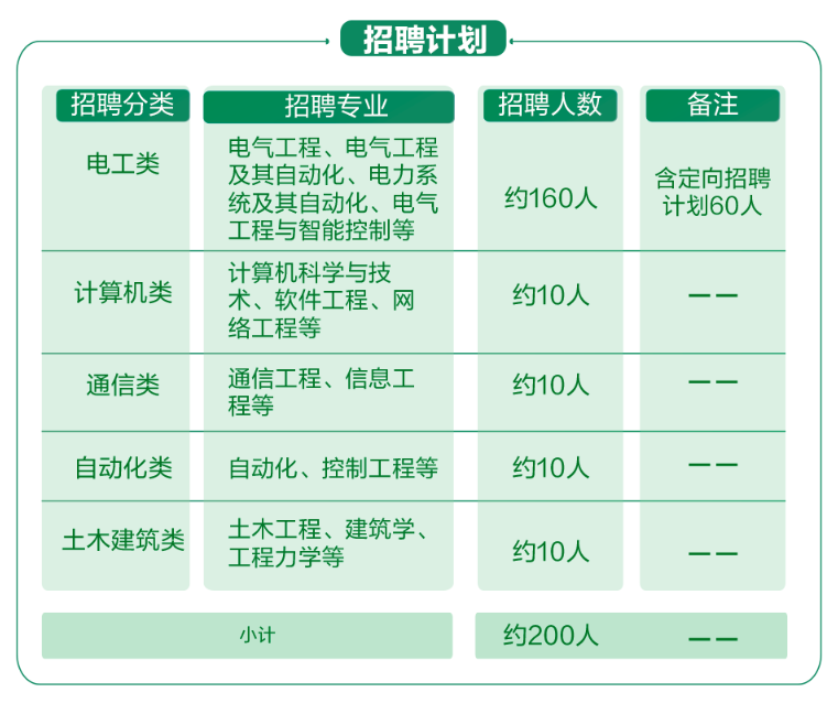 电工类、计算机类、通信类、自动化类、土木建筑类专业。招聘专业均指主修专业,不包含辅修专业及第二学位。
