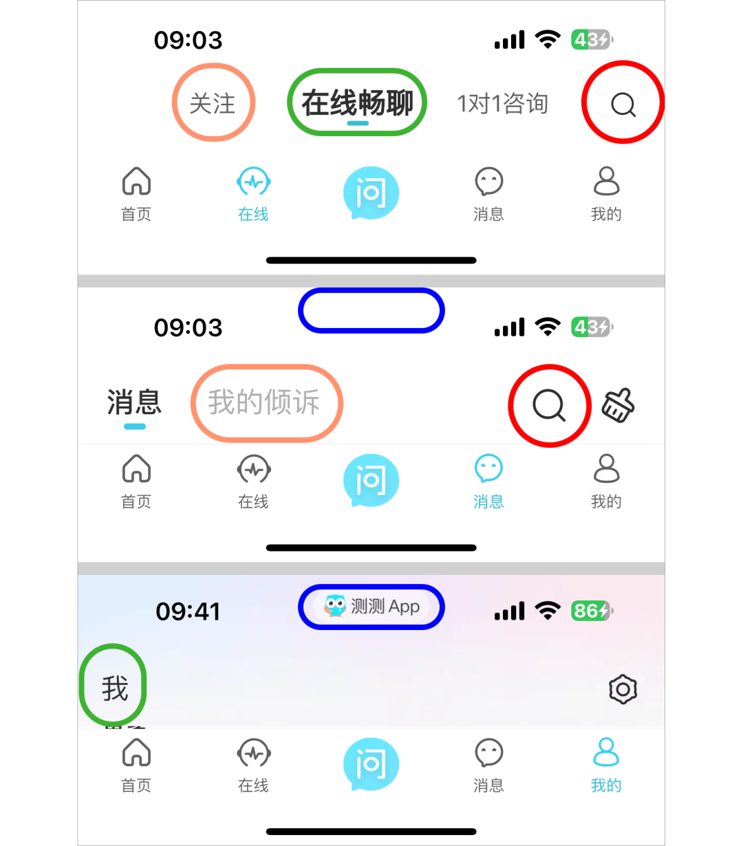 下面以某小众App为例,三个不同的主页的顶部导航,就有4处不一致的地方: