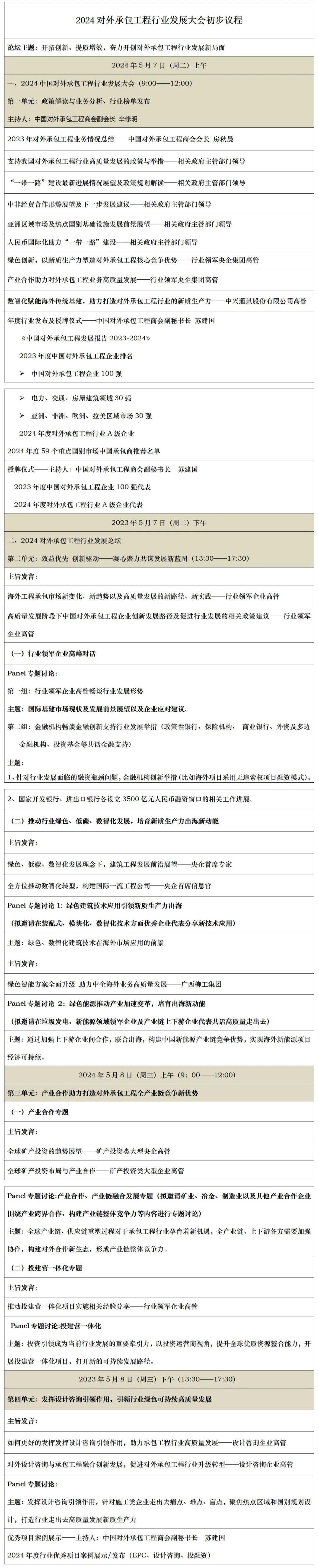 过去的2023年,我国对外承包工程行业在复杂严峻的外部环境影响下,仍然实现了逆势增长,成绩难能可贵。展望未来,全球基础设施建设需求在经济复苏、绿色转型、数智化发展的推动下正在持续扩大,第三届“一带一路”国际合作高峰论坛提出的高质量共建“一带一路”八项行动正在逐步落实,行业即将迎来新的发展机遇期。但我们也要看到,在世界百年未有之大变局加速演进的大环境下,行业发展仍处于爬坡过坎的转型期,传统发展模式遭遇瓶颈,市场集中度越来越高,同质竞争日趋激烈,市场隐性风险持续扩大,也需要全行业思考探寻妥善应对举措。在此背景下,我会拟于5月7-8日在北京丽泽厦航嘉年华酒店举办“2024对外承包工程行业发展大会暨2024中国对外承包工程行业发展论坛”,认真总结发展经验,积极探索高质量发展道路。本届会议以“开拓创新、提质增效,奋力开创对外承包工程行业发展新局面”为主题,拟邀请商务部、国资委、发改委等政府主管部门、行业智库、金融机构及相关专业服务机构、行业领军企业及上下游企业代表出席会议,共同分析行业发展面临的新形势以及机遇与挑战,分享项目开发成功经验和模式,展望行业未来发展的新趋势,探寻行业创新发展合作的新路径、新模式,携手开创高质量发展新局面。时间:2024年5月7-8日,会期2天