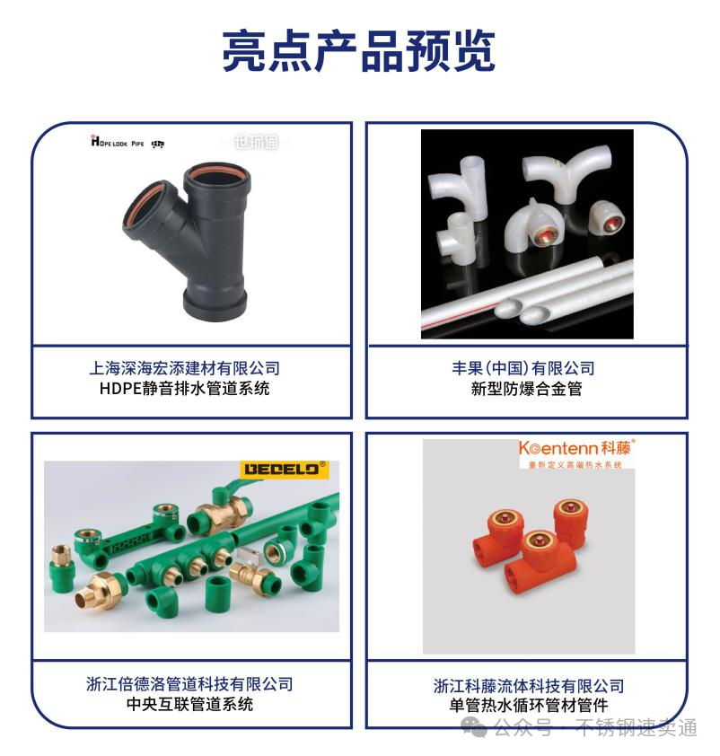 更有宏添、丰果、倍德洛、科藤分别带来了合金防爆管、同层排水、一管到底、管中管等特色产品及技术亮相,积极推动行业的创新和发展,为管道行业的未来注入更多活力和可能性。