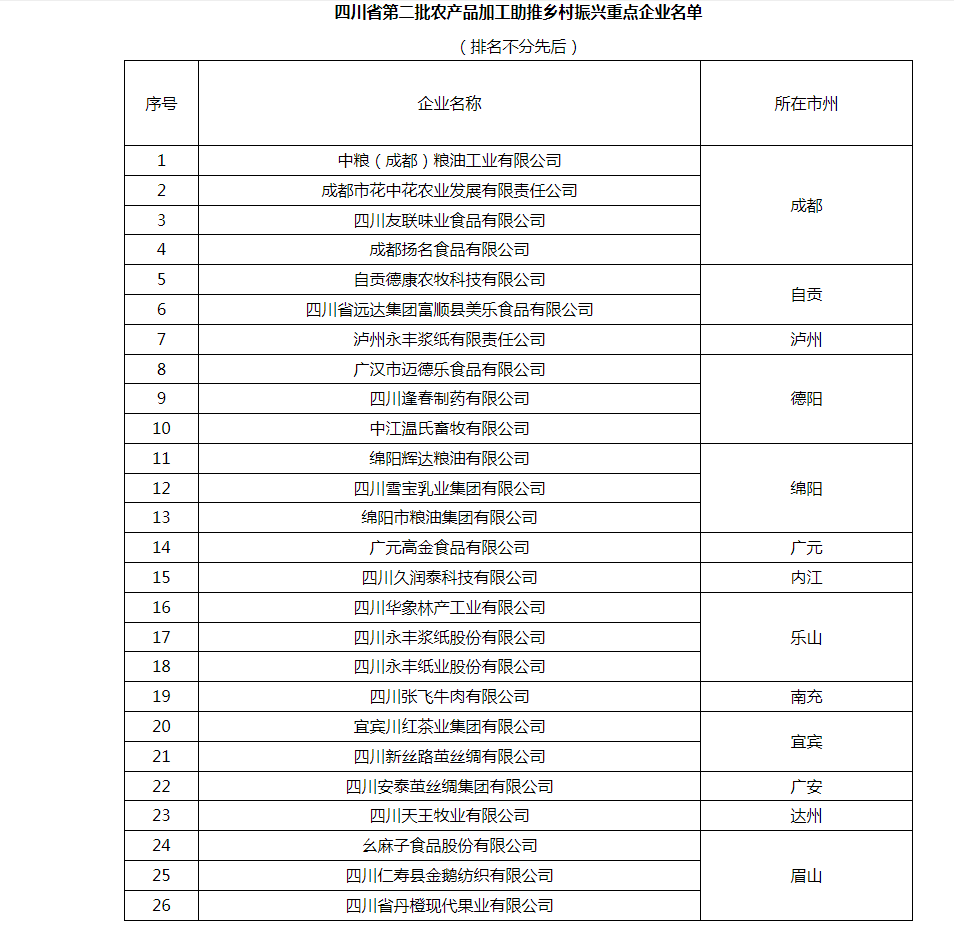 为贯彻落实省委、省政府关于推动乡村振兴的决策部署,充分发挥工业和信息化助推乡村振兴作用,根据《四川省农产品加工助推乡村振兴重点企业认定及培育办法》(川经信规〔2022〕3号),我厅组织开展了四川省第二批农产品加工助推乡村振兴重点企业认定工作。经企业申报、市(州)推荐、专家评审、现场核查、征求省级相关部门意见等程序,认定中粮(成都)粮油工业有限公司、成都市花中花农业发展有限责任公司等26户企业为四川省第二批农产品加工助推乡村振兴重点企业。