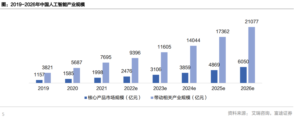 2021年人工智能核心产业规模预计达到1998亿元规模,预计将于2026年超过6000亿元,对应2021年到2026年的CAGR为24.8%,带动产业规模超过2万亿元。随着越来越多的头部企业登陆资本市场,市场份额将进一步集中。