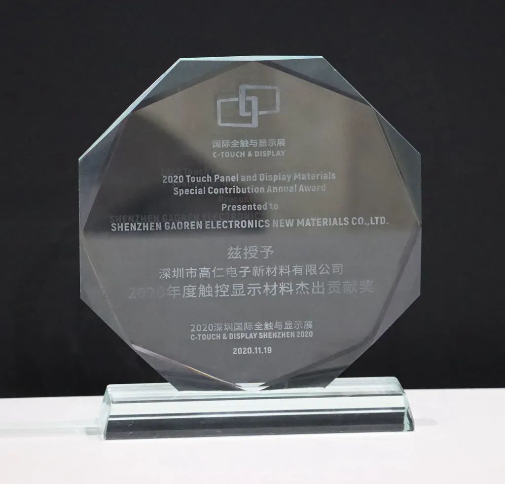 凭借优秀的触控显示材料展品和先进的材料技术,高仁新材在现场专家团的评审下,还获得了本届展会的《2020年度触控显示材料杰出贡献奖》。