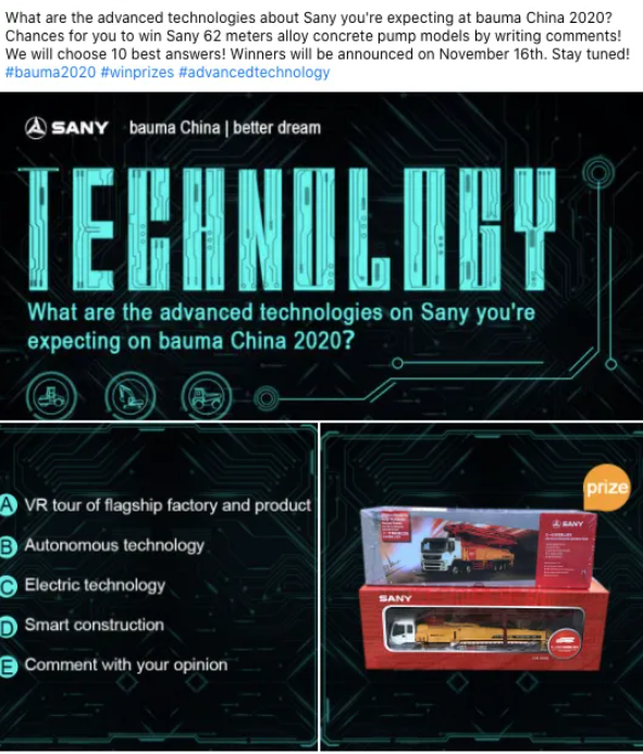 在2020年的Bauma CHINA期间,三一集团曾经以#Bauma2020为主话题,积极地在社交媒体上进行宣传和营销。他们共发布了将近20条与该话题相关的文章,占据了整个11月份发文总数将近7成。可以说,在那个月份,三一集团的Facebook主页几乎都在围绕这一话题展开各种营销活动。
