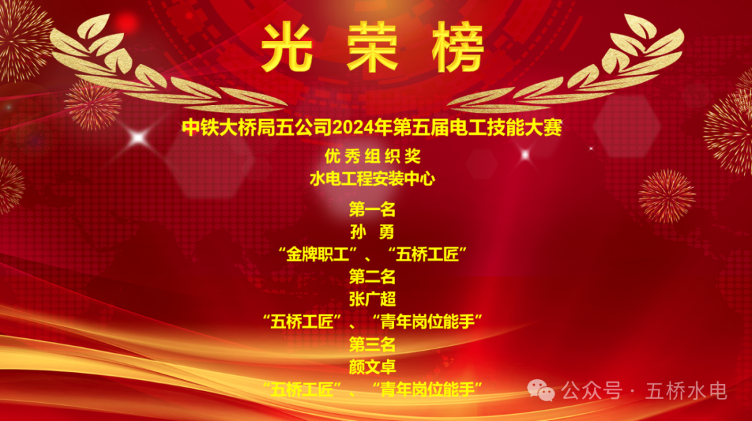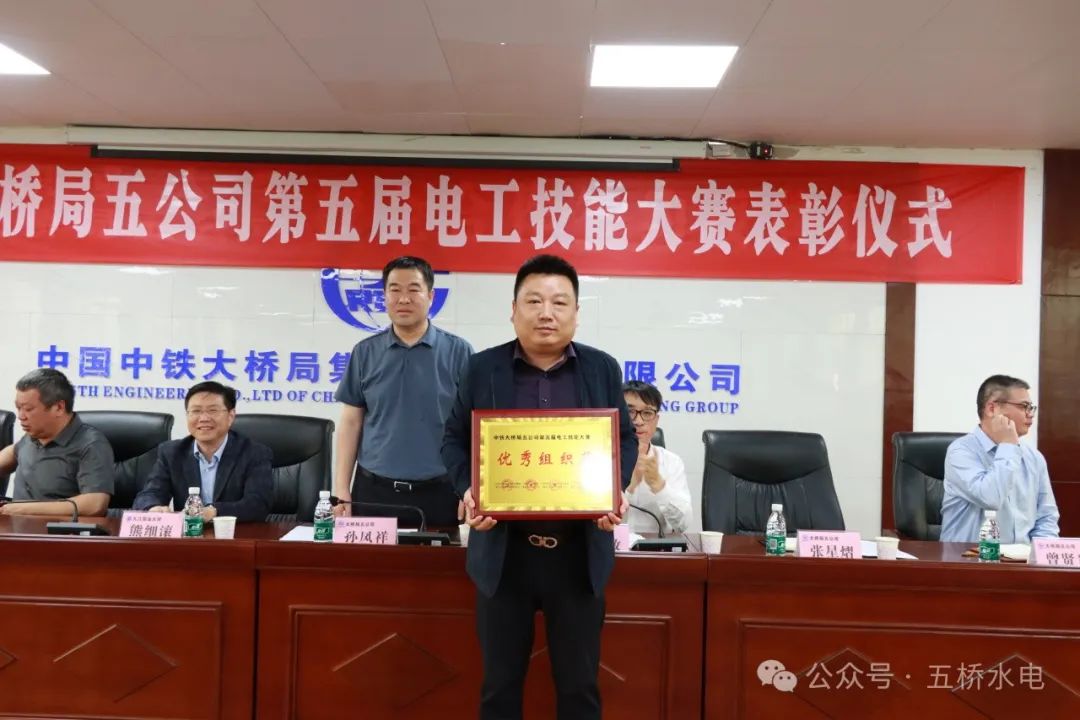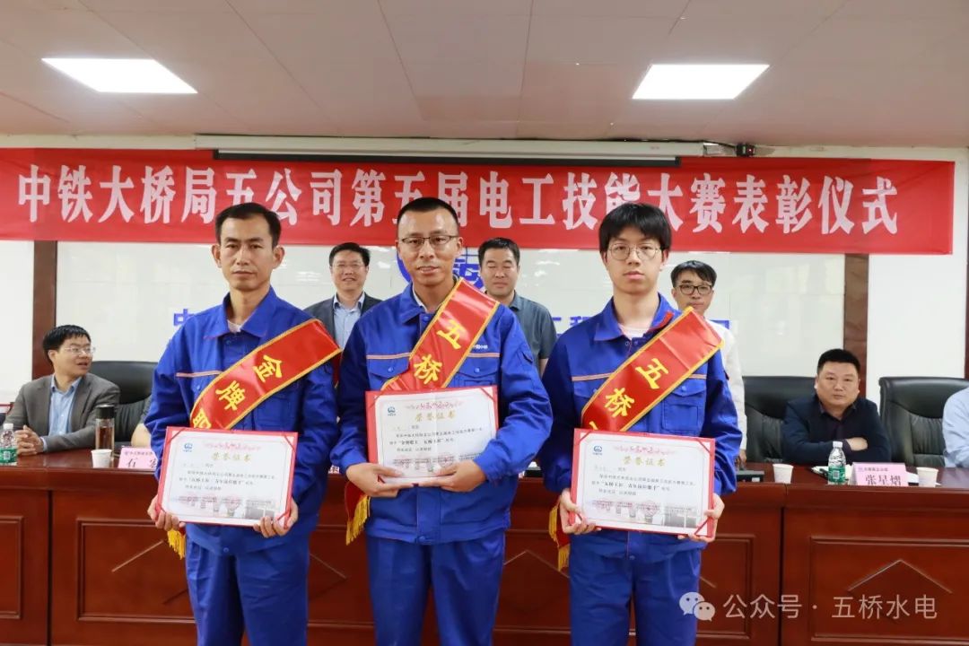 大会对此次比赛中表现突出的选手进行了表彰,授予“金牌职工”、“五桥工匠”、“青年岗位能手”称号,并授予水电工程安装中心“优秀组织奖”称号。同时,本着优中选优的原则,选拔出的八位优秀选手,组建两支参赛队伍,代表五公司参加中铁大桥局集团第十六届职工技能大赛电工比赛。