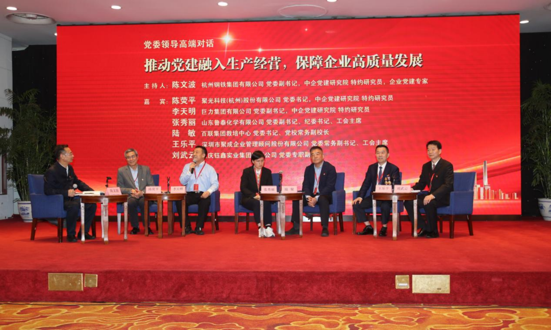 在企业党委领导高端对话环节,围绕“推动党建融入生产经营,保障企业高质量发展”主题,聚光科技(杭州)股份有限公司党委书记、中企党建研究院特约研究员陈荧平,巨力集团有限公司党委副书记、中企党建研究院特约研究员李天明,山东鲁泰化学有限公司党委副书记、纪委书记、工会主席张秀丽,百联集团教培中心党委书记、党校常务副校长陆敏,深圳市聚成企业管理顾问股份有限公司党委常务副书记、工会主席王乐平,重庆钰鑫实业集团有限公司党委专职副书记刘武云分享了企业在党建工作方面的做法与经验。 杭州钢铁集团有限公司党委副书记、中企党建研究院特约研究员、企业党建专家陈文波主持对话。