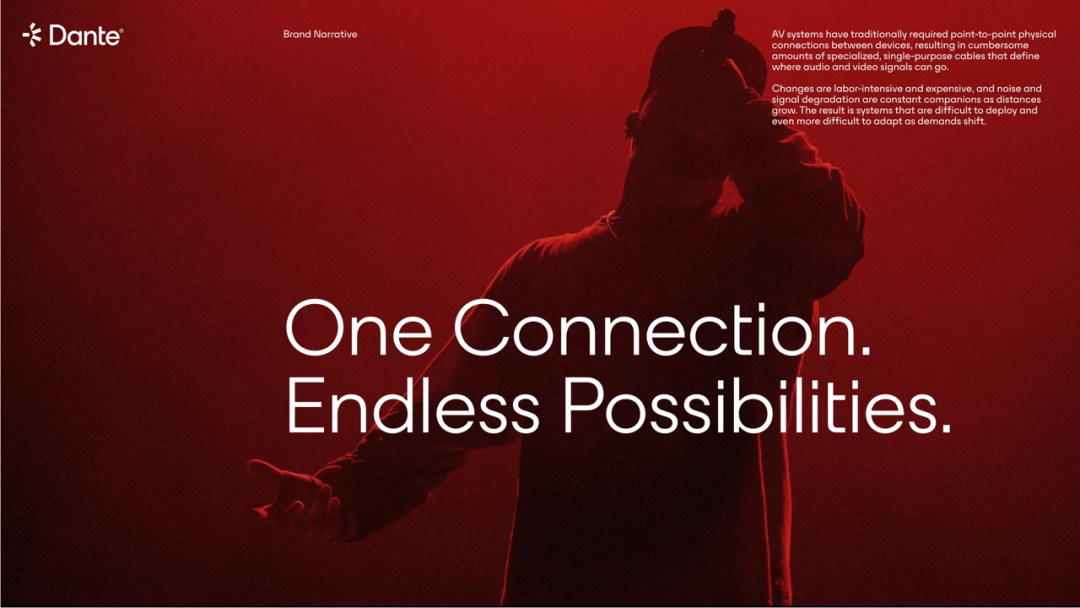 Dante是一款专注于简单易用的音视频连接的网络平台。Dante通过允许在一根以太网电缆上传输和接收多通道音频和视频,彻底改变了行业。它让凌乱的音视频电缆成为遥远的记忆。借助Dante,您可以通过一条连接享受到完美的音频和视频质量。