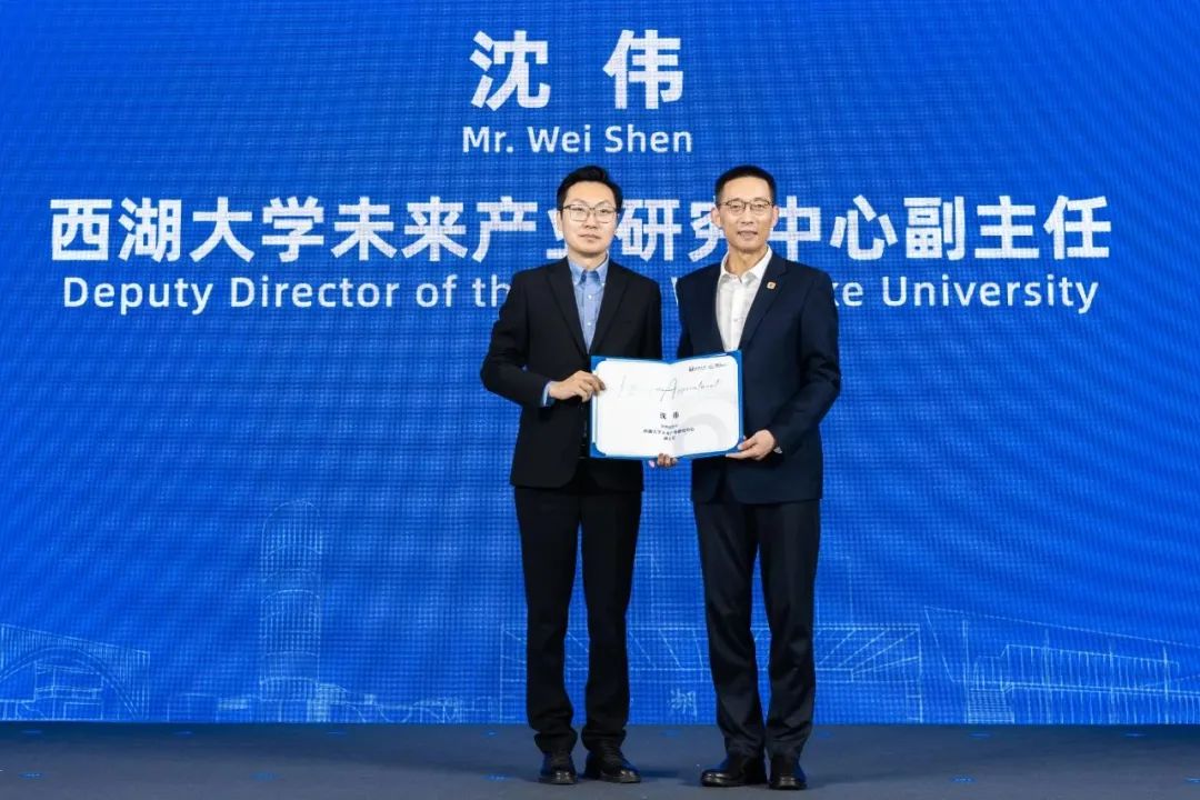 西湖大学校长、西湖大学未来产业研究中心主任施一公为沈伟颁发聘书