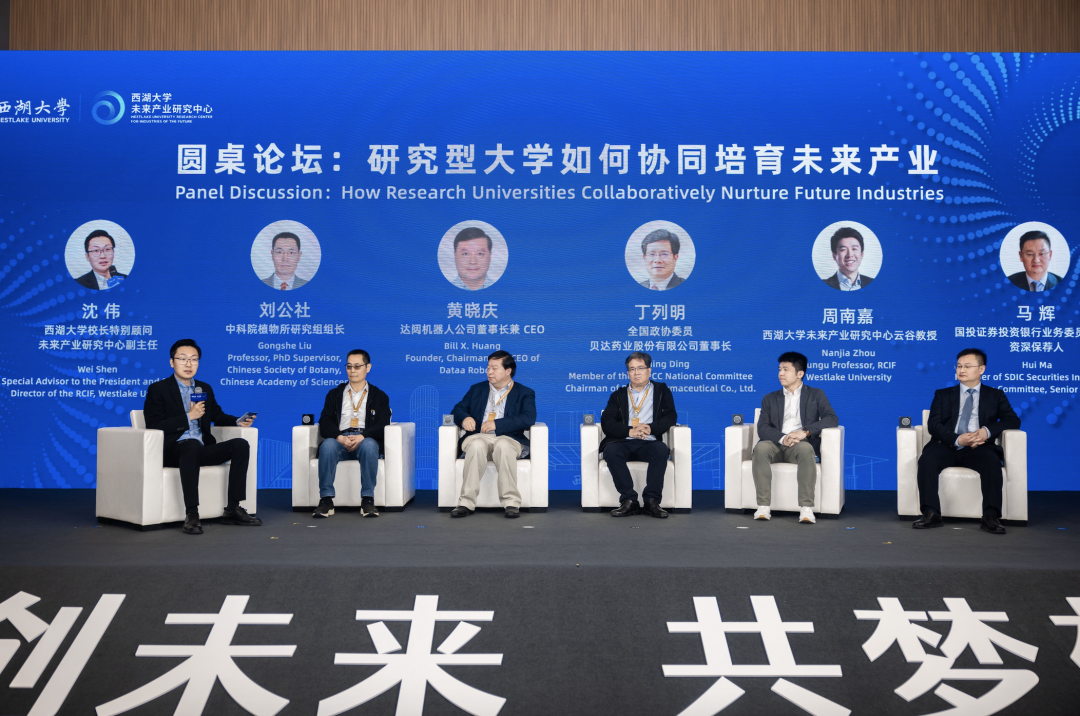 最后,围绕“研究型大学如何协同培育未来产业”这一主题,全国政协委员、贝达药业股份有限公司董事长丁列明,达闼机器人公司董事长兼CEO黄晓庆,中科院植物所研究组组长刘公社,西湖大学工学院助理教授周南嘉,国投证券投资银行业务委员会委员、资深保荐人马辉等展开圆桌讨论,国投科创总经理沈伟担任主持。