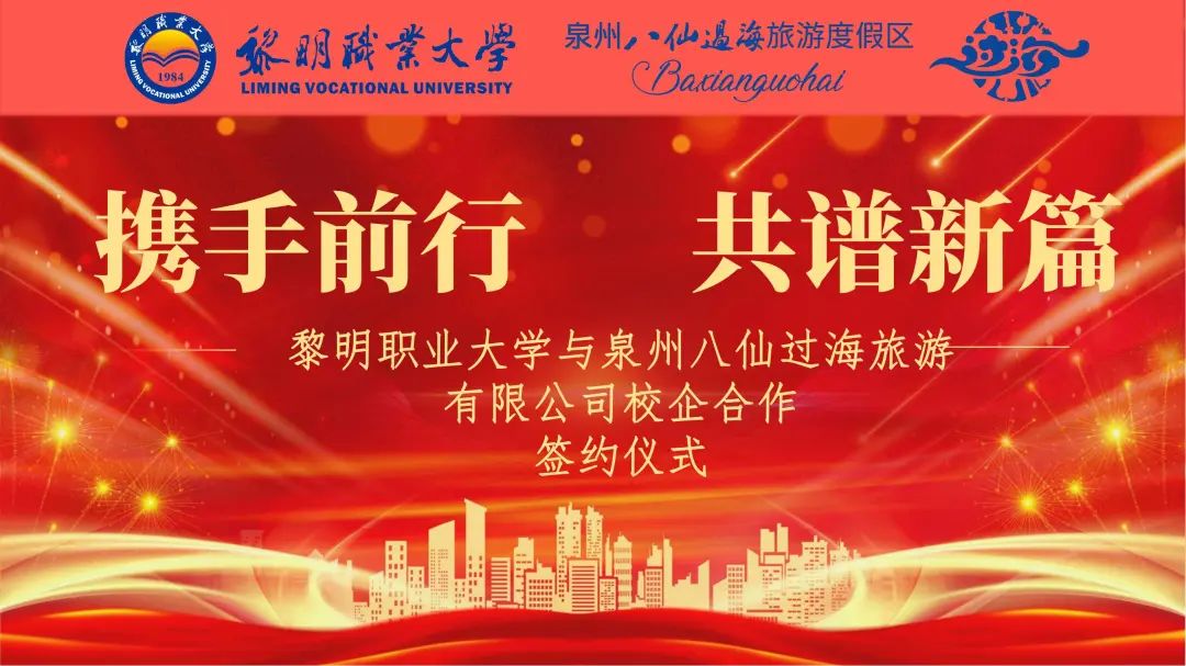 为加强校企合作,促进双方人才培养及资源共享,4月12日,泉州八仙过海旅游有限公司与黎明职业大学举行校企合作签约仪式。黎明职业大学党委副书记、校长王锋,文化传播学院院长王俊忠等院领导;泉州八仙过海旅游有限公司总经理凌丽华、副总经理兼市场营销中心总监姜山、副总经理兼酒店总经理冷双凯以及相关部门负责人参加活动。