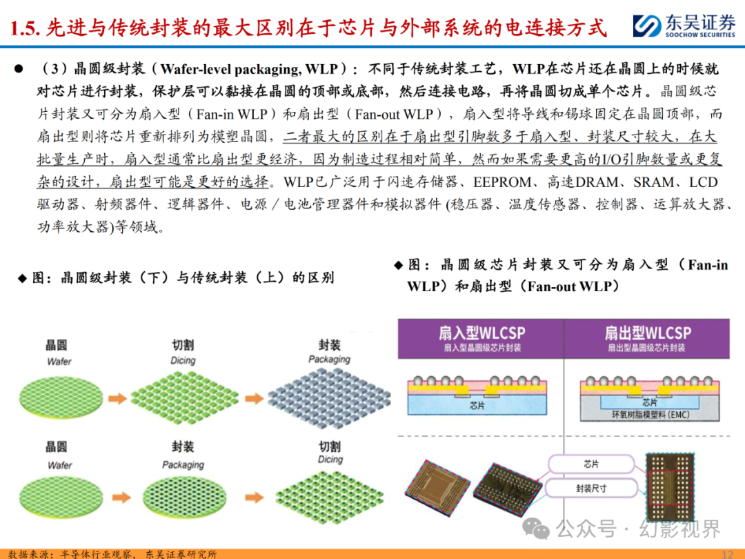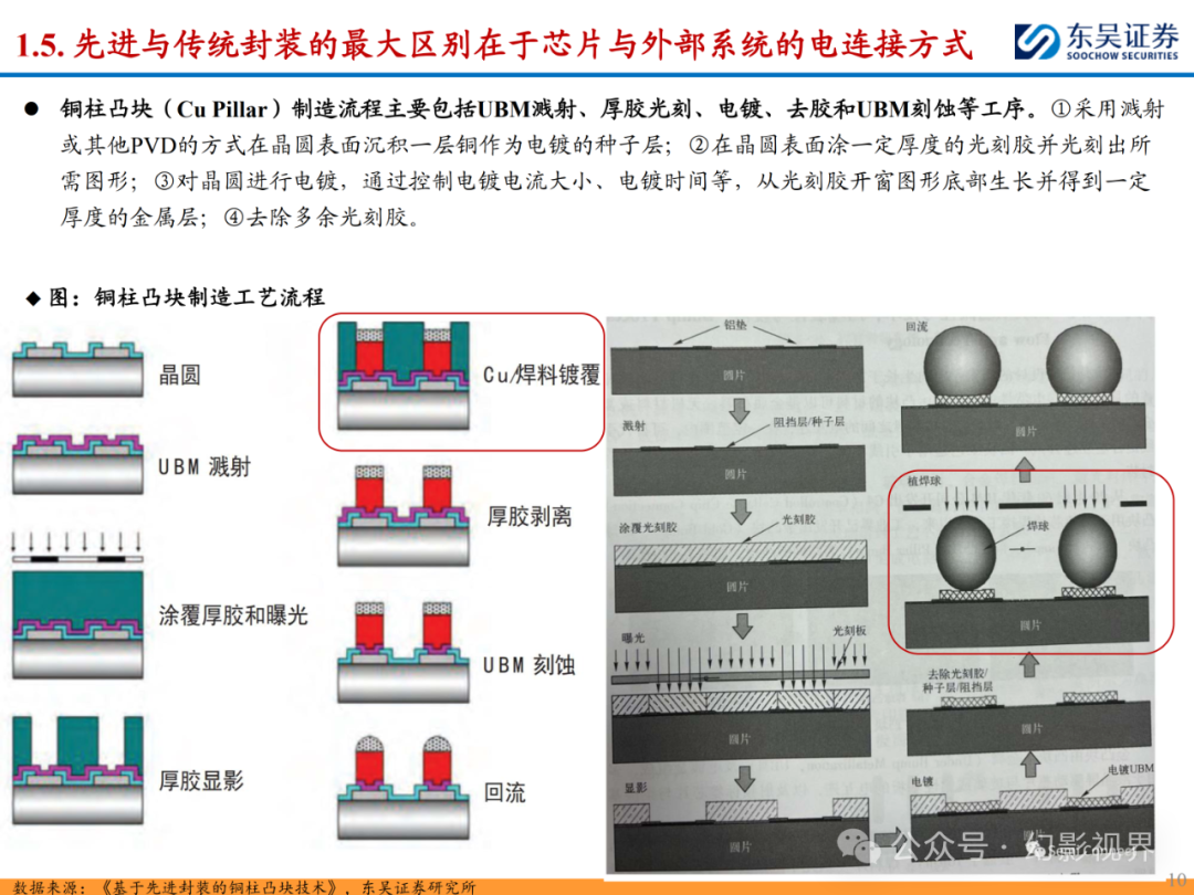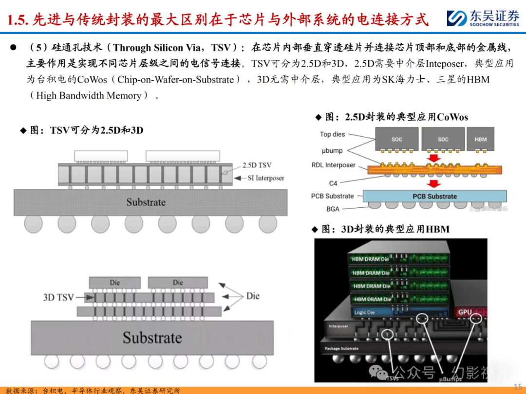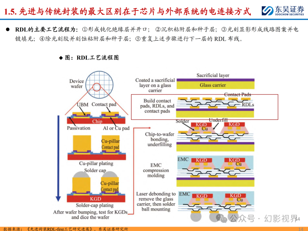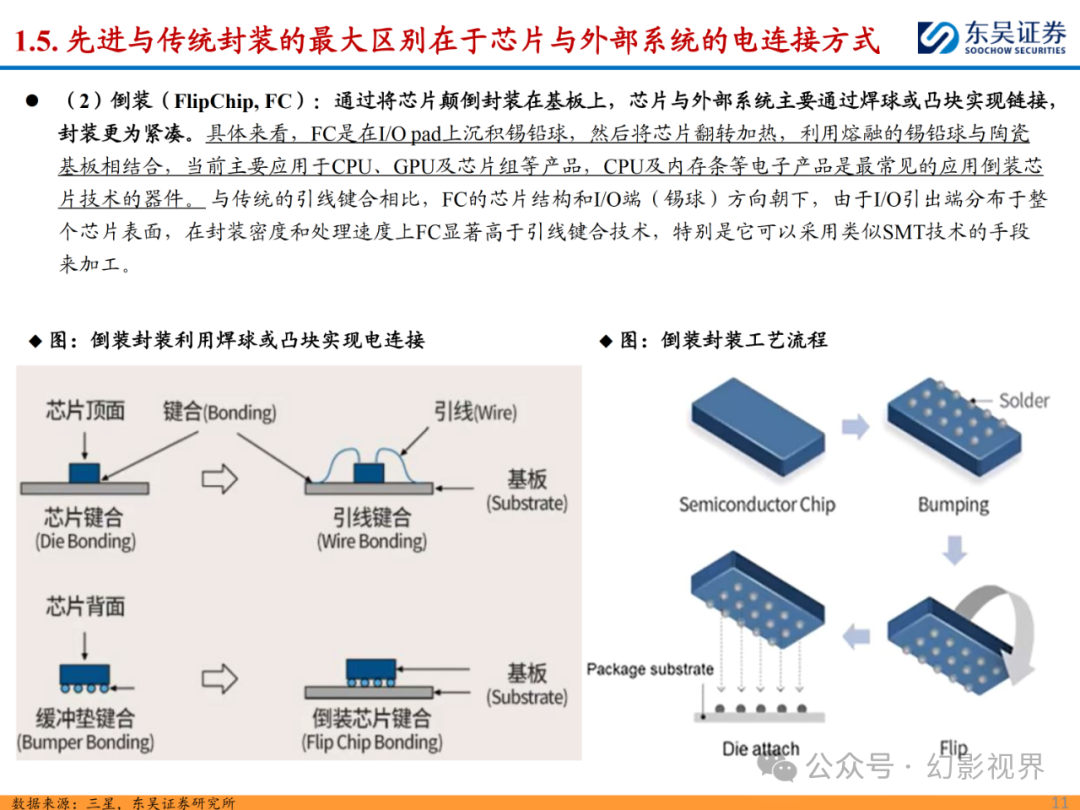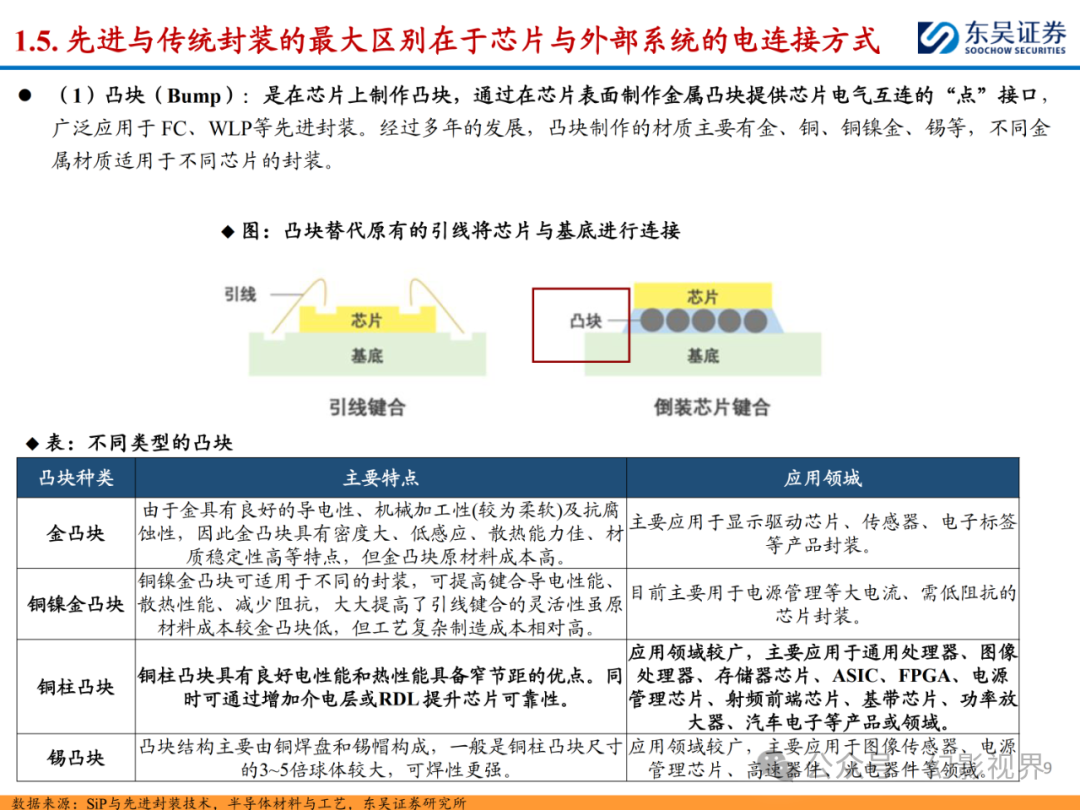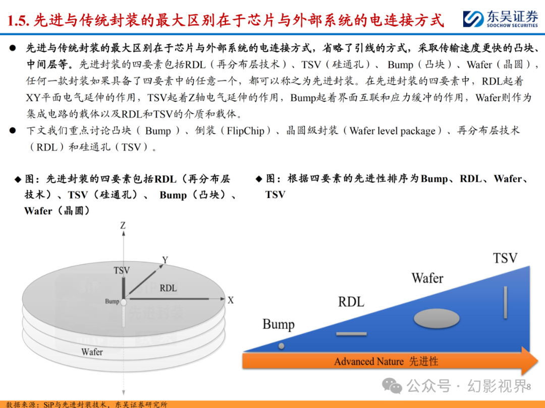 随着先进制程工艺逐渐逼近物理极限,越来越多厂商的研发方向由“如何把芯片 变得更小”转变为“如何把芯片封得更小”,先进封装快速发展。先进与传统封装最大区别在于芯片与外部电连接方式, 先进封装省略引线,采取传输速度更快的凸块、中间层等,主要包括凸块( Bump )、倒装(Flip Chip)、晶圆级封装 (Wafer level package)、再分布层技术(RDL)和硅通孔(TSV)技术等。
