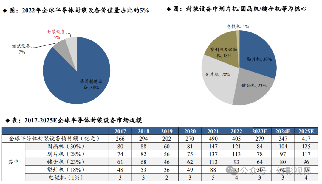 半导体封装设备价值量占比约5%,固晶机/划片机/键合机等为核心后道封装设备占半导体设备的价值量比重约5%,贴片机/划片机/键合机等为核心设备。根据SEMI,2025年全球 半导体封装设备市场规模有望达59.5亿美元(按照2024年4月13日汇率7.24计算,对应人民币市场空间约430.8亿 元),其中固晶机(贴片机)占比30%,划片机(切片机)占比28%,键合机占比23%。