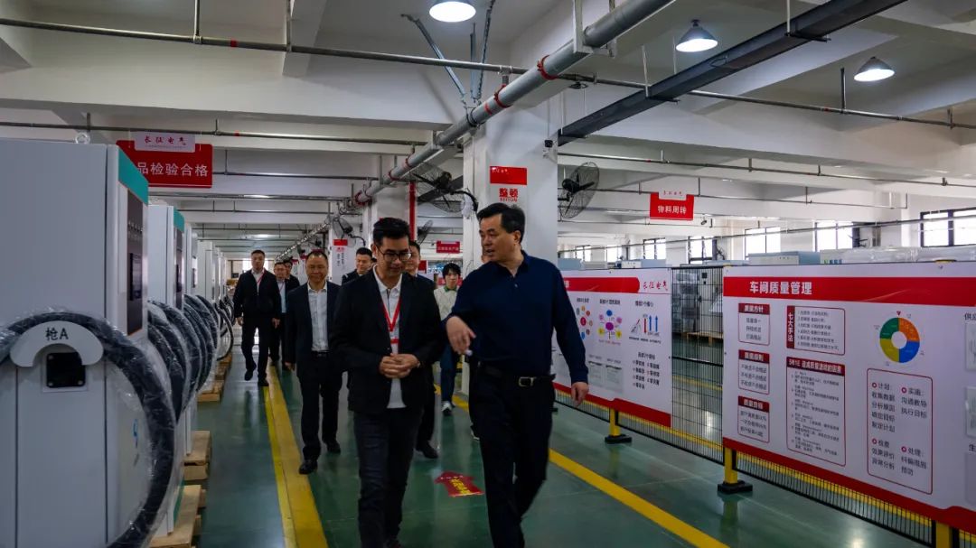 徐书记先后考察了长征电气新能源展厅和新能源车间,详细了解了长征电气近几年的发展情况以及在新能源市场的未来规划。此次调研中,双方围绕充电桩、工商业储能等产品做了深入的沟通。在新能源展厅双方针对2023年长征电气荣获的“揭榜挂帅”重大工业科技项目-全液冷超快充产品做了全面的交流,叶晓克详细介绍了这款产品的情况以及目前的研发进展。在了解全液冷超快充后,徐书记实地考察了新能源车间充电桩测试区域以及单体直流、分体直流超快充两条生产线。