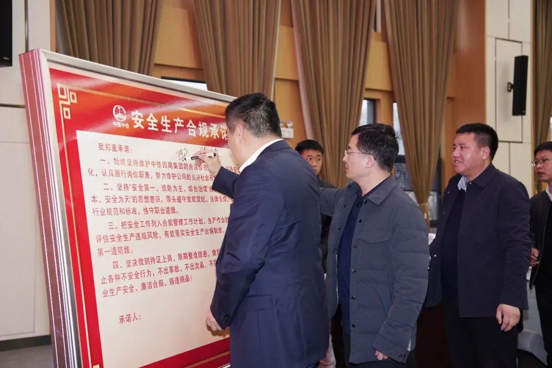 随后,中铁四局总法律顾问陈楠,中铁四局第四工程有限公司总经理、党委副书记毕清泉带领大家签署安全生产合规承诺书。