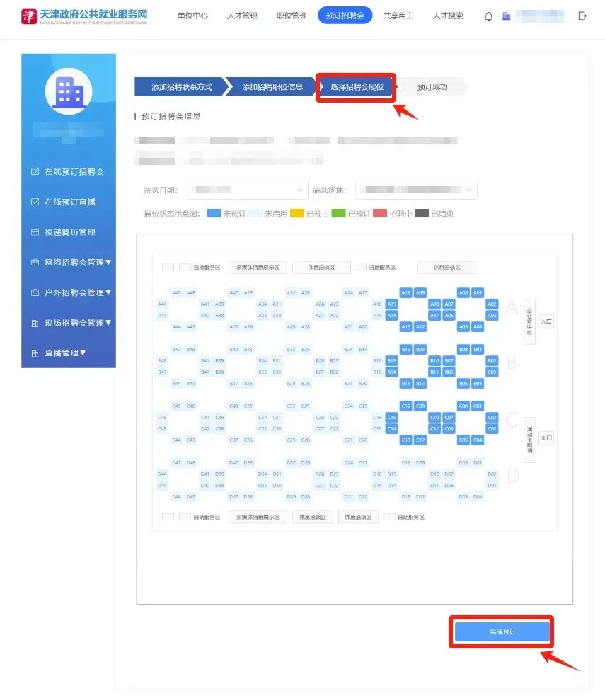 4、选择招聘会展位,然后点击完成预订。