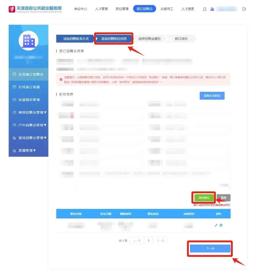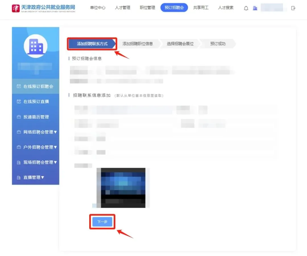 2、确认预定招聘会信息、添加招聘会联系方式之后,点击【下一步】。
