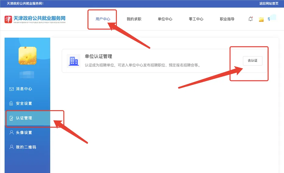 登录成功后,进入用户中心>认证管理>单位认证管理,点击“去认证”,逐项填写完善单位信息并提交平台审核,平台审核通过后单位即可登录本平台进行招聘会展位预定。