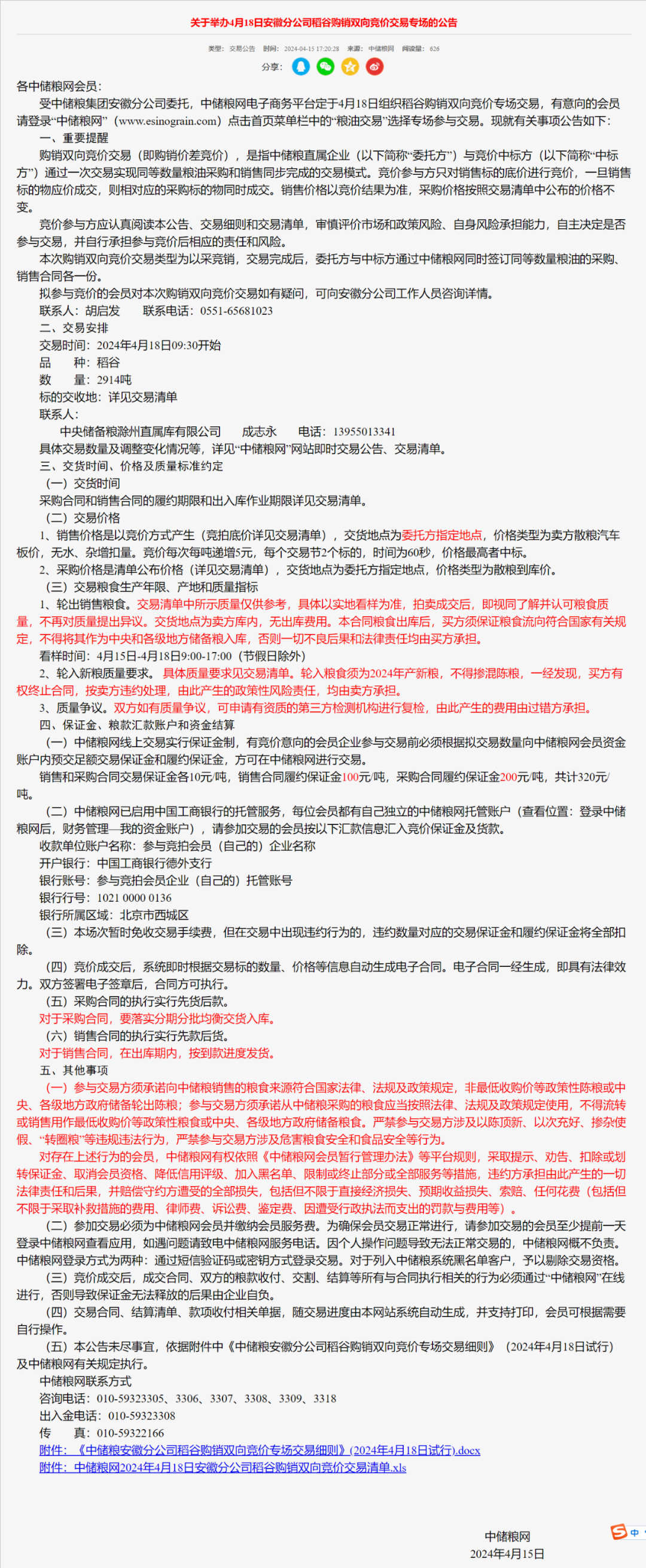 关于举办4月18日安徽分公司稻谷购销双向竞价交易专场的公告