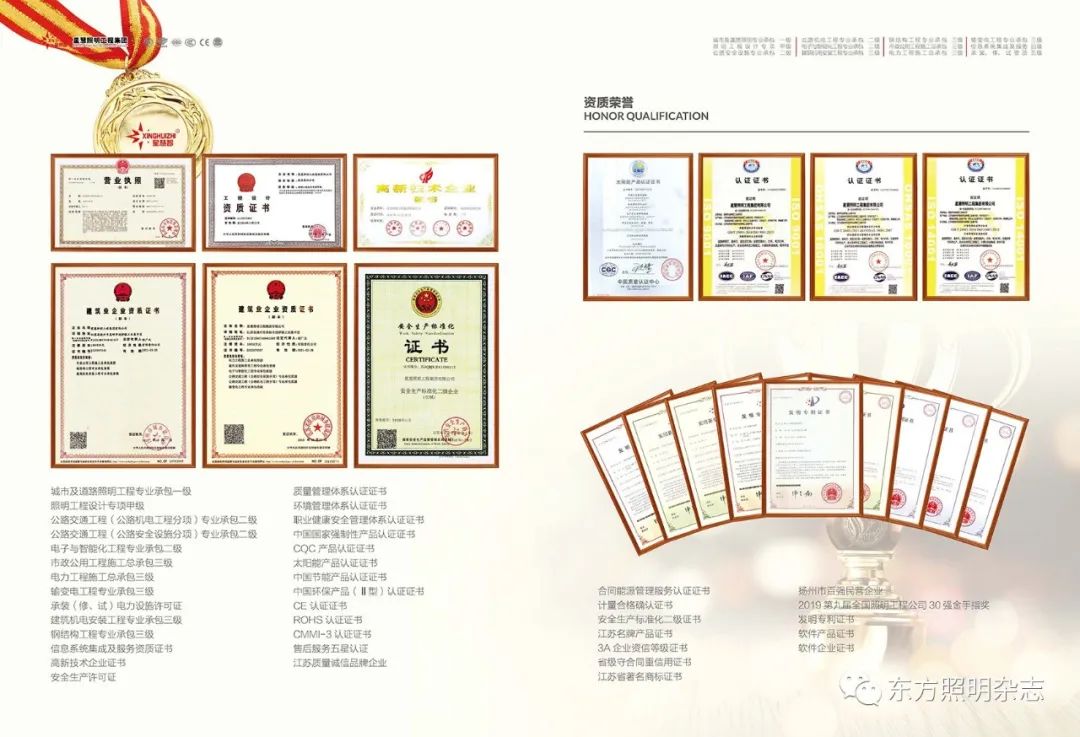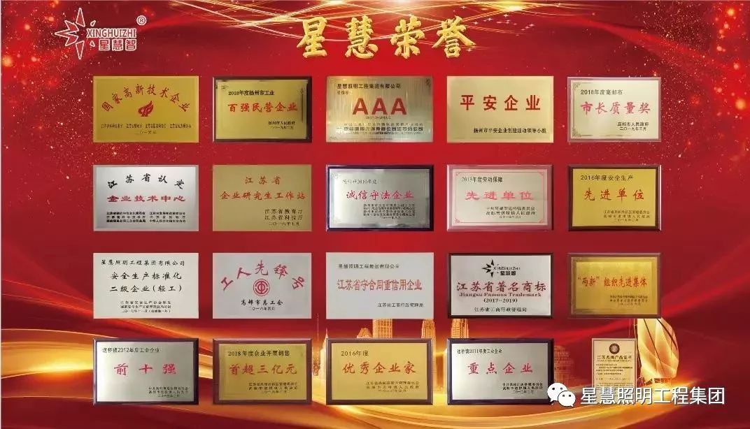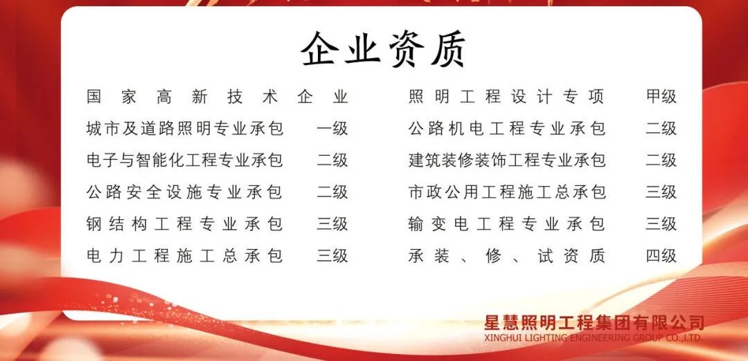 星慧照明工程集团资质实力雄厚,目前拥有“城市及道路照明专业承包一级资质”、“照明工程设计专项甲级资质”、“电子与智能化工程专业承包二级”、“公路安全设施分项专业承包二级资质”、“公路机电工程专业分项承包二级资质”、“建筑机电安装工程专业承包二级资质”、“市政公用工程施工总承包三级资质”、“钢结构工程专业承包三级资质”、“电力工程施工总承包三级资质”、“输变电工程专业承包三级资质”、“信息系统集成及服务四级资质”、“承装(修、试)”五级资质。公司荣幸被评为省重合同守信用企业、省质量信得过企业、AAA级资信企业,并成功通过ISO9001:2015质量体系认证、ISO14001:2015环境体系认证、“CE”认证及“CCC”及“CQC”国家强制性产品认证、中国节能产品认证。公司成立江苏省研究生工作站,并先后荣获江苏省名牌产品、省著名商标、高邮市市长质量奖、扬州市百强民营企业等荣誉证书,被江苏省认定为企业技术中心,并顺利通过安全生产标准化二级企业验收并取得证书,为企业的跨越性发展打下健康稳健的基础!