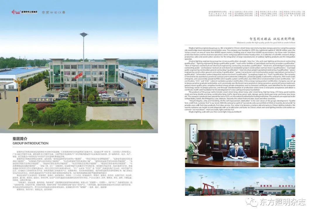 星慧照明工程集团有限公司座落在中国路灯制造基地:江苏省高邮市送桥镇工业集中区。公司成立于1999年,注册资金1.0058亿元,厂区占地8万多平方米,建筑面积6.5万多平方米,主要下辖三大功能生产厂区和两处商务运营中心及集团行政总部,是一家集科研、设计、生产、 销售、施工服务为一体的大型户外照明产品制造商和集成运营商。
