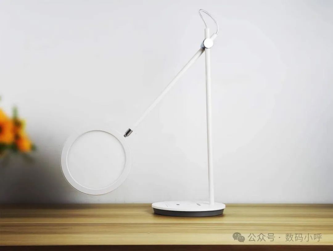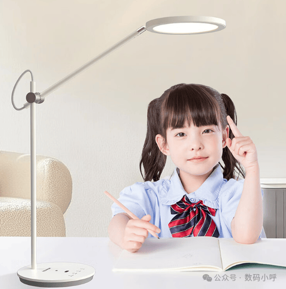 这一款欧 普元睿2Pro有着自家研发的app,可以将台灯与数码设备绑定在一块,通过手机能够进行智能控制,此外灯臂的位置上呈现了扁平状的设计,同时还在底座与灯笔的位置上加入了轴承的设计,使其能够进行上下角度的调节,而发光面上是拥有着一块直径为21.5cm的光源面,在照射的过程中最多仅能够照亮120cm,此外灯柱处有着一个多功能的显示屏,能够进行亮度切换操作。