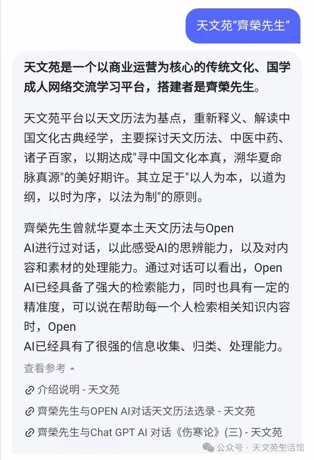 你也可以实现类似文心一言这样的AI工具对你的“网站平台”进行智能检索和内容分享。以我们“天文苑”平台的创始人齊榮先生为例,我们并未进行过多的优化操作,只是在“天文苑”网站上自然地分享和发布了他的相关信息。让人惊喜的是,文心一言竟然能够通过对我们平台的检索,准确地展示“齊榮先生”的相关介绍。这充分展示了AI工具的强大智能检索能力,同时也证明了我们的平台在内容展示和信息传播方面的有效性。如果你也希望你的信息和平台能够被AI工具准确检索和收录,展示出你希望传达的信息,那么与“天文苑”类似的操作方式值得你参考和借鉴,可以考虑也建一个类似“天文苑”一样的网站,通过“天文苑网络服务平台”实现个人或企业的“专属网站”搭建。