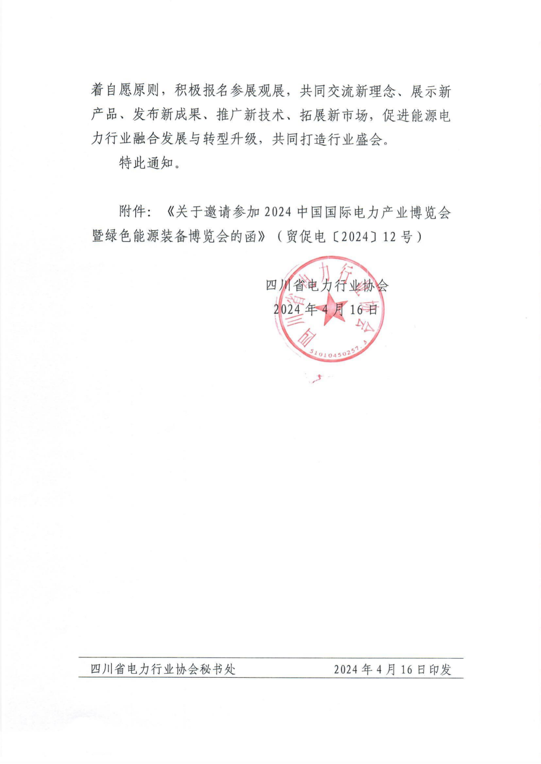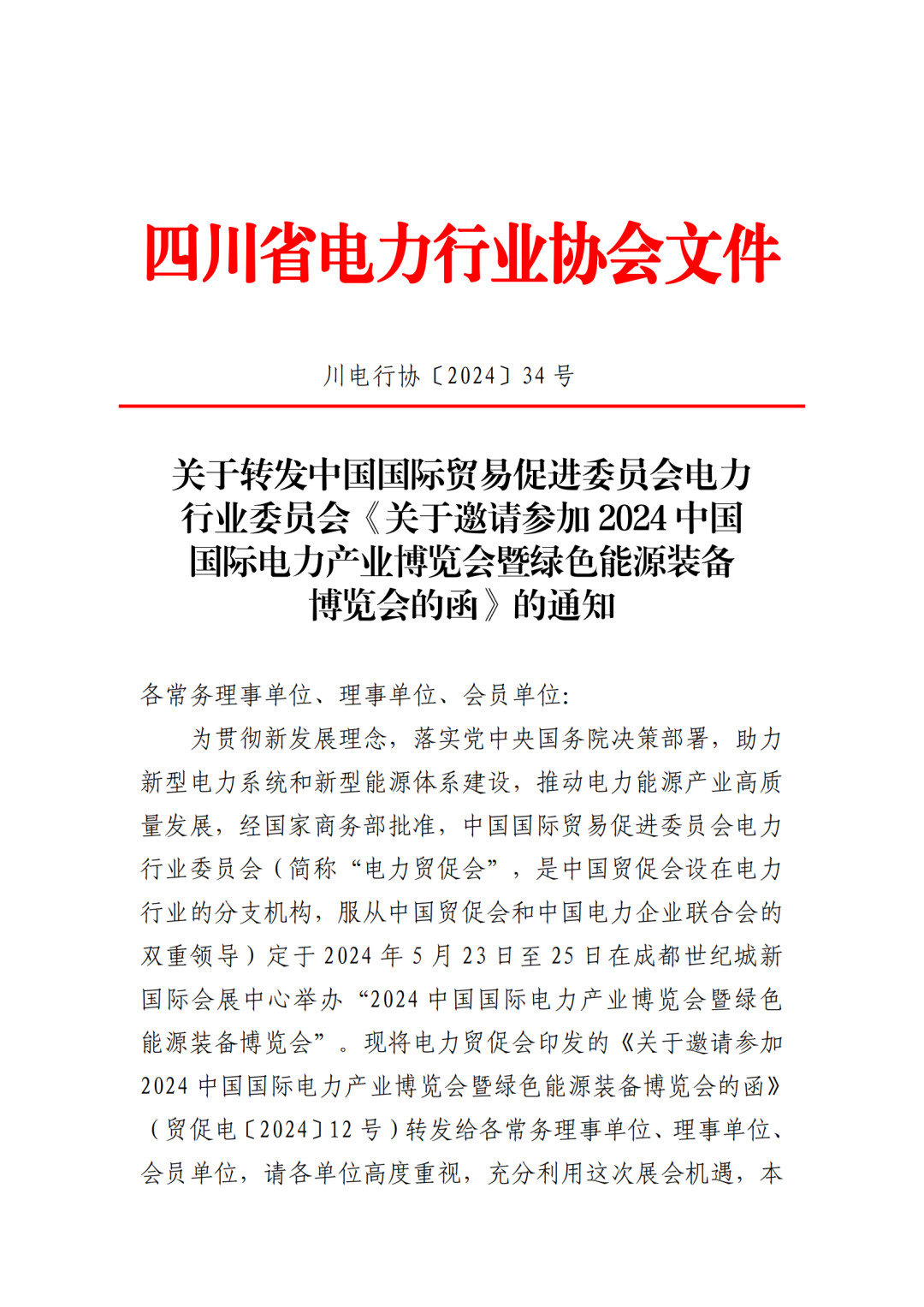 4月16日,四川省电力行业协会发出关于转发中国国际贸易促进委员会电力行业委员会《关于邀请参加2024中国国际电力产业博览会暨绿色能源装备博览会的函》的通知,邀请行协各常务理事单位、理事单位、会员单位参加即将于5月23—25日在成都世纪城新国际会展中心举行的2024中国国际电力产业博览会暨绿色能源装备博览会。