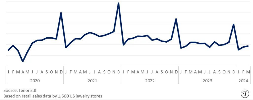 三月份需求疲软导致零售商的散钻销售收入下降,尽管销量有小幅增长。三月份,按单位计算,销售增长了 2%,按价值计算下降了 13%。