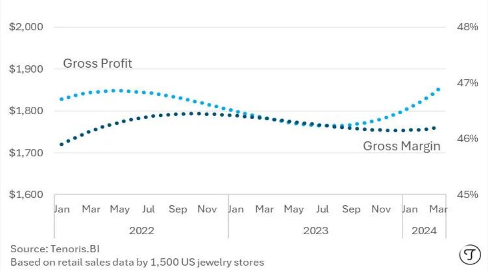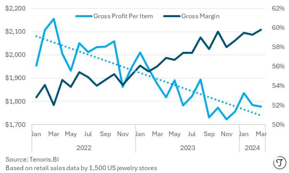 合成钻石订婚戒指的平均零售毛利率在 2022 年 1 月至 2024 年 3 月的两年内下降了 4.8%。