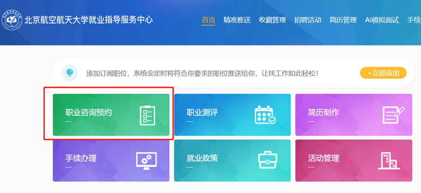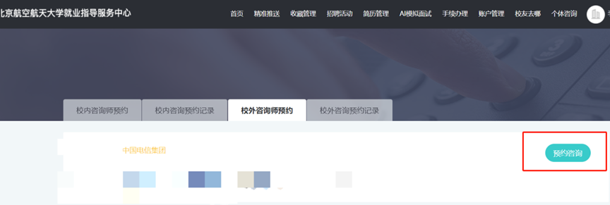 1.登录北航就业资讯网(career.buaa.edu.cn),使用统一身份认证登录,登录后选择“职业咨询预约”模块;