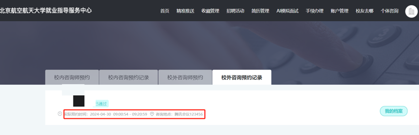 5.校外导师咨询系统还在试运行阶段,如果同学们在预约或咨询过程中发现任何问题或有任何建议,可以发送邮件至邮箱bhjiuye@126.com。