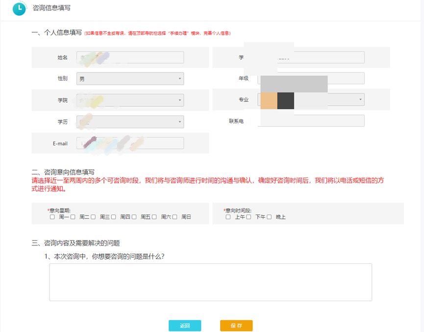 3.进入咨询信息填写页面,请选择职业咨询的意向时间(可多选),并填写咨询信息,全部填写完成后点击“保存”;