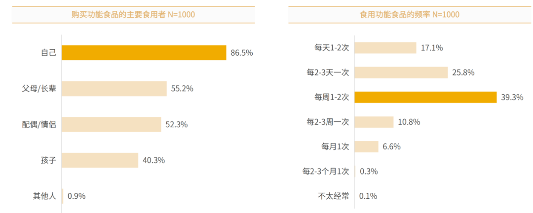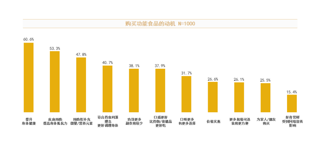 通过对功能食品行业趋势和消费状况的调研分析,我们发现不同年龄段的人们对健康的关注程度显著提升,愿意为健康和功能食品付费。随着科技的发展和产品的创新,功能食品的产品形式和售卖渠道更加多元化,品牌营销也极为丰富,这些都增加了消费者购买和食用功能食品的欲望。