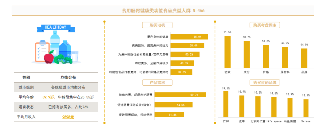 这类消费者多为 80 后已婚有孩人群,平均年龄为 39.9 岁,属于中年人群,没有明显的性别倾向。他们购买功能食品的目的是提升身体健康,对产品的需求主要集中在健脾养胃、促进消化吸收和促进肠胃蠕动等方面。这类消费者购买目标明确,更关注功能食品的功效,占购买因素的 71.5%。仁和和江中属于传统品牌,更符合中年消费者对于肠胃养护的需求,占比较高。