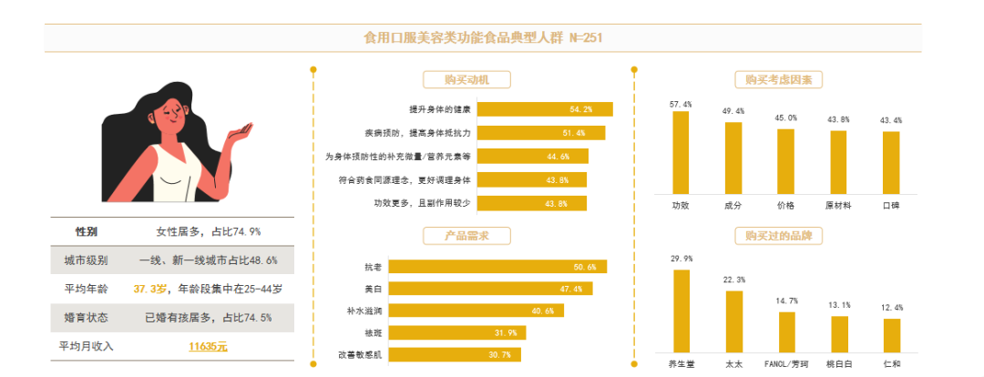 在经济发达城市,女性是口服美容类功能食品的主要购买者。她们通常拥有较高的收入和较强的消费能力,平均年龄低于体重管理者和肠胃健康守护者。这些女性在抗衰老、美白等方面有着较高的需求。消费者在购买口服美容类功能食品时,更加看重产品的功效,这一因素占购买决策的 57.4%。养生堂和太太是主要的购买品牌。消费者对品牌的选择与年龄有一定的关系。美丽呵护者的平均年龄为 37.3 岁,她们更加青睐传统大品牌。