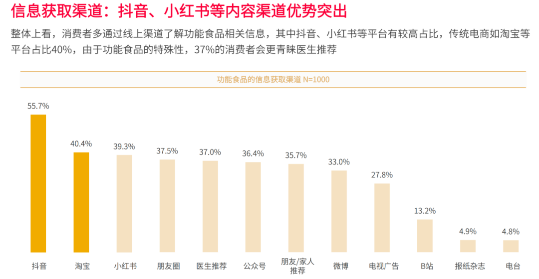 整体来看,消费者主要通过线上渠道获取功能食品的相关信息,如抖音、淘宝、小红书和微博等。其中,37%的消费者更倾向于选择医生推荐,认为这样更具专业性。与传统的电视广告和纸质媒介相比,线上渠道的信息传播速度更快、更容易触及消费者,因此成为了一种效果良好的“种草”渠道。