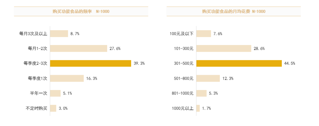 消费者平均每月购买1次,这体现消费者是有固定的购买习惯,与消费者的食用频率相契合。在消费者金额上,单次平均花费387元。月均花费301-500元占比44.5%,消费者的购买能力较高。这一表现也与购买考虑因素相契合,相对于价格消费者更加关注功效和成分,消费者期待物有所值。企业在设计产品成本及制定产品价格时,也可根据消费者实际花费适当确定价格。