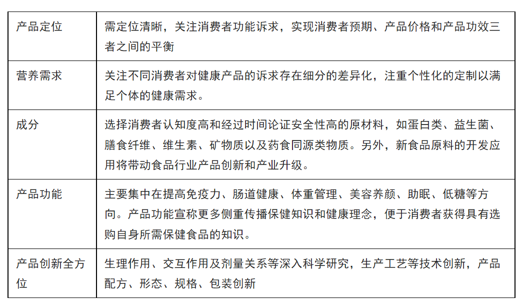 在法规逐步完善,市场规模完备的情况下,功能食品经过几十年的发展,已经呈现清晰的发展趋势,对于企业来讲,产品的定位离不开对于消费者营养需求的洞察,企业在选择相应成分以期达到相应功能时也应该基于消费者以及市场的反馈,并在其中持续对产品全方位创新。