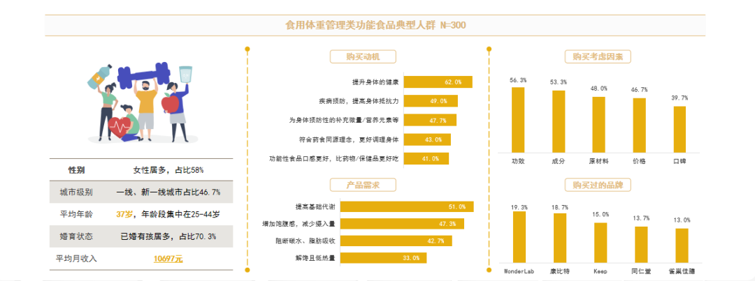 有体重管理需求的消费者人群特征为高线、高收入的有孩中年人群。女性消费者更倾向于通过功能食品来实现体重管理的目的。他们的初衷仍然是提升身体健康,但重点在“瘦身”,他们需要能够提升基础代谢、增加饱腹感、阻断碳水和脂肪吸收、解馋且低热量的功能食品,功能需求呈现多样性,对功效和成分的关注度基本持平。