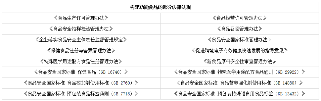 我国功能食品的构建以《中华人民共和国食品安全法》和《中华人民共和国食品安全法实施条例》为基础,以多个管理办法、规定、标准等为核心(下方图表为部分罗列)。这些法律法规标准涵盖了所有品种和绝大部分环节,形成了具有中国特色、比较完整的标准法规体系。在过去几十年内,功能食品的创新与发展离不开国家法律法规体系的完善。无论是生产经营,还是食品成品及原料创新,都离不开法律法规的监督,每一次法规的革新都将带来功能食品行业的革新。