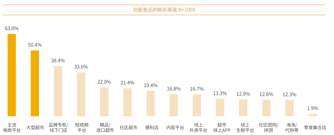在购买功能食品时,消费者的首选是主流电商平台,其次是大型超市和品牌专柜。电商平台因其信息传递快速、购买便捷,成为消费者的首选。而大型超市作为品质保证的“代言人”,也是消费者重要的购买渠道。值得关注的是,大量种草信息的短视频平台和内容平台虽占据前四,但其自带的广告属性也不容小觑,未来或可提供推荐和购买的一站式服务。