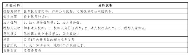 意向投标单位需提供以下资料,邮件形式发送我司招标负责人邮箱,并电话复核是否查收。未电话复核确认,导致报名登记有误的投标人自行承担不利后果。