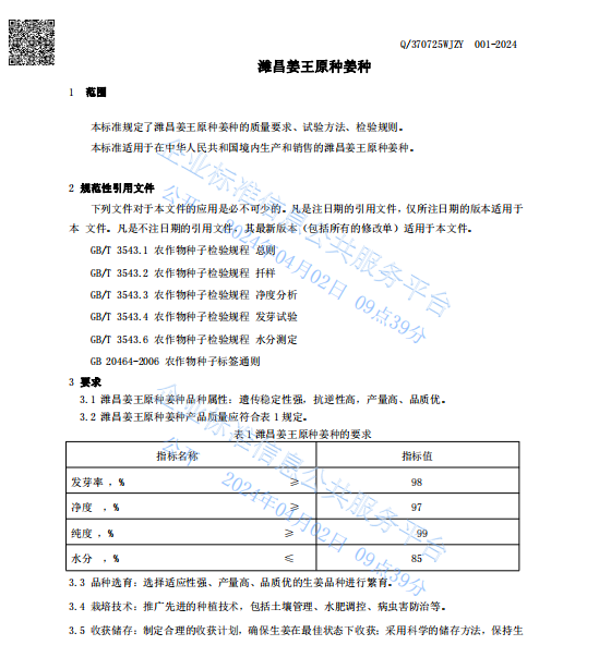 潍姜种业姜种执行标准涵盖了从品种选育、栽培技术到收获储存的每一个环节,通过选择适应性强、产量高、品质优的生姜品种进行繁育,推广先进的种植技术,制定合理的收获计划,采用科学的储存方法,保持生姜的品质和活性,确保生姜种植过程的科学性与系统性。