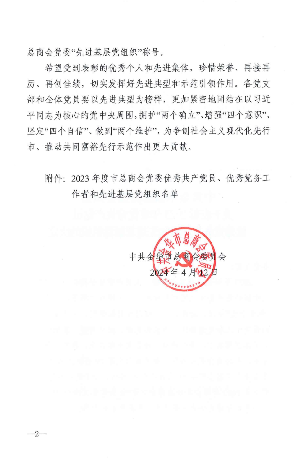 2024年4月12日,金华市福建商会党支部再次被评为“先进基层党组织”。