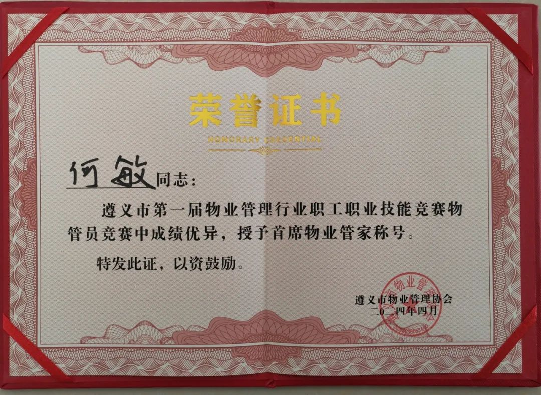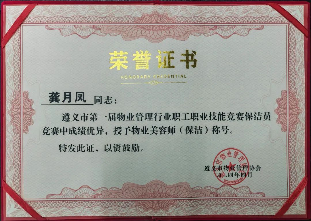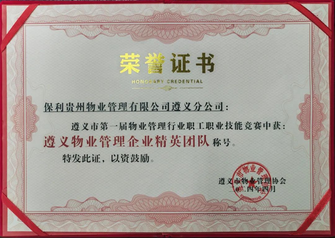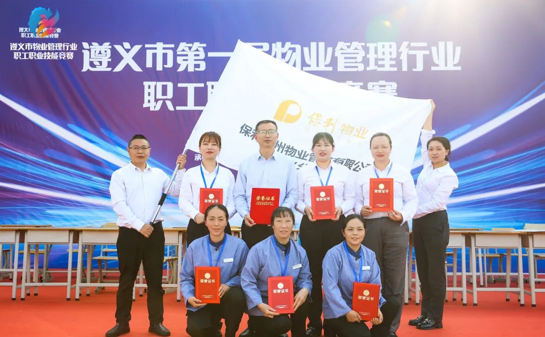 保利物业贵州区域公司积极组建遵义分公司队伍参赛,在物业管家、环境保洁两个竞赛项目激烈的角逐中,保利物业贵州区域公司代表队以总分第一获“遵义市物业管理精英团队”奖,参赛的罗鹏、何敏、潘琴、杨林芳、陈大梅、龚月凤六名选手分别获得“首席物业管家”、“优秀物业管家”、“物业美容师”的称号。