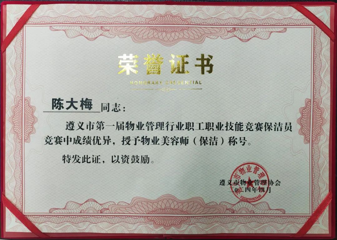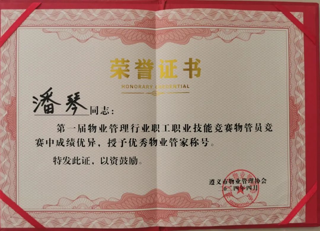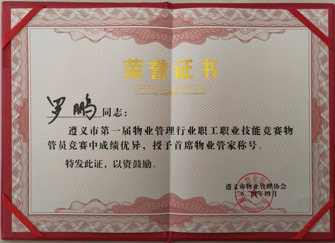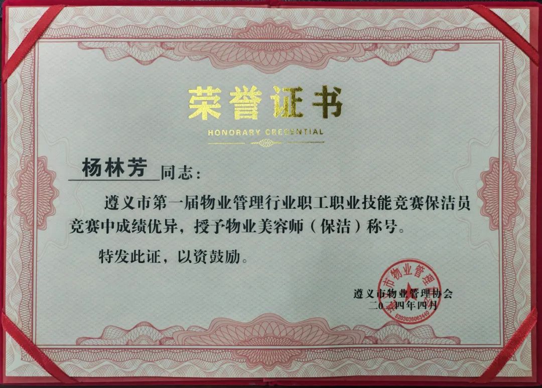 保利物业贵州区域公司积极组建遵义分公司队伍参赛,在物业管家、环境保洁两个竞赛项目激烈的角逐中,保利物业贵州区域公司代表队以总分第一获“遵义市物业管理精英团队”奖,参赛的罗鹏、何敏、潘琴、杨林芳、陈大梅、龚月凤六名选手分别获得“首席物业管家”、“优秀物业管家”、“物业美容师”的称号。
