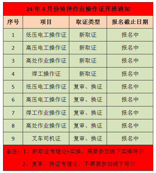 3、特种作业人员复审须参加知识更新培训,成绩合格后,办理复审(换证)手续;