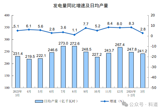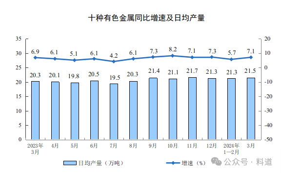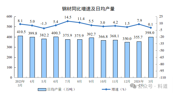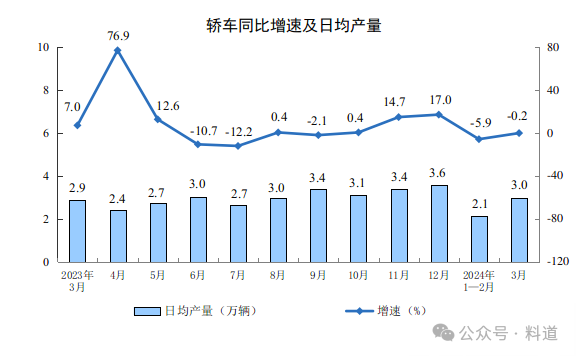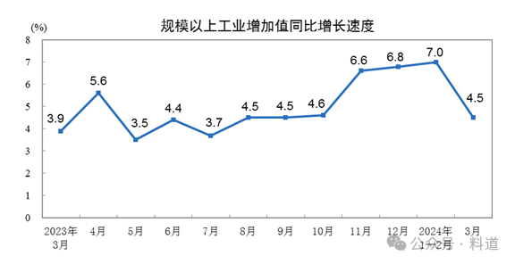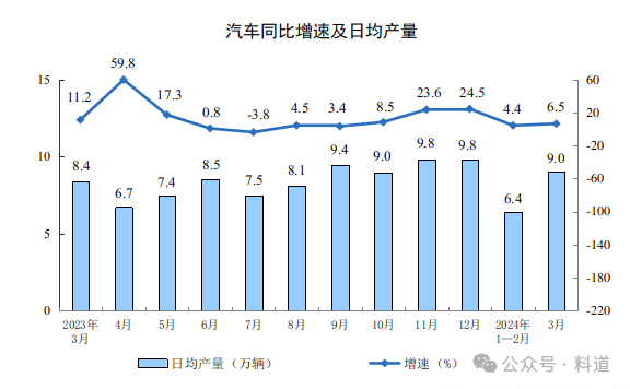 分产品看,3月份,619种产品中有338种产品产量同比增长。其中,钢材12337万吨,同比增长0.1%;水泥15440万吨,下降22.0%;十种有色金属667万吨,增长7.1%;乙烯277万吨,增长3.6%;汽车279.4万辆,增长6.5%,其中新能源汽车88.4万辆,增长33.5%;发电量7477亿千瓦时,增长2.8%;原油加工量6378万吨,增长1.3%。